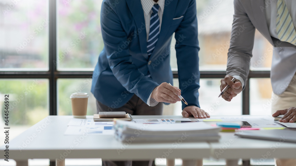 Business people, teamwork and meeting for strategy, planning or corporate brainstorming discussion at office. Business people meeting explaining the financial graph data and marketing plan.