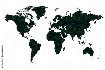 World map made up of various detailed trees on solid white background including the shadows. This 3D illustration of a forest is conceptual of the global green environmental issues worldwide.
