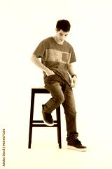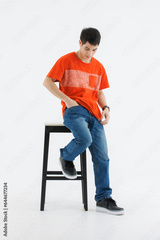 Portrait isolated cutout studio shot Asian smart handsome male fashion model in fashionable casual outfit t shirt blue jeans and sneakers sitting posing on chair look at camera on white background