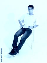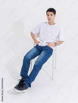 Portrait isolated cutout studio shot Asian handsome cool male fashion model in casual fashionable t shirt and blue jeans sitting on chair holding hand in pocket look at camera on white background