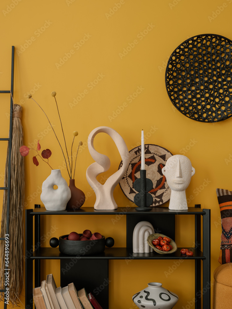 Creative composition of yellow living room interior with black console, stylish sculpture, vase with dried flowers, black ladder, colorful basket, pillow and personal accessories. Home decor. Template