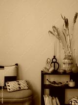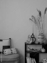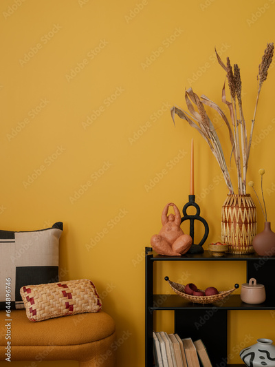 Creative composition of yellow living room interior with black console, stylish sculpture, vase with dried flowers, decoration, colorful basket, pillow and personal accessories. Home decor. Template