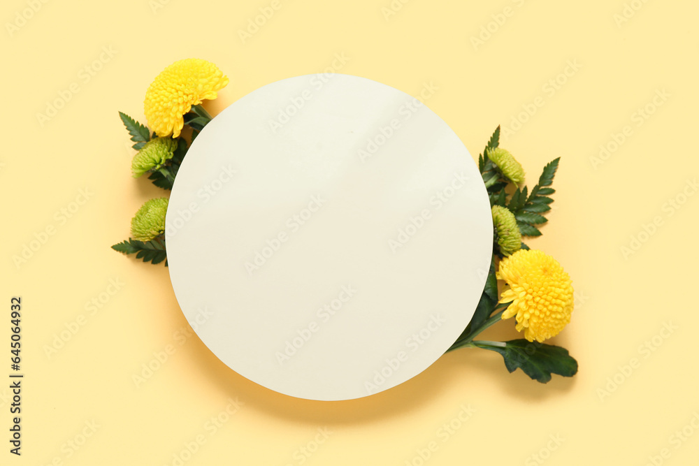 Composition with blank paper sheet and beautiful chrysanthemum flowers on beige background