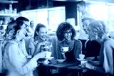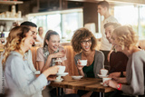 Young and diverse group of friends talking while having coffee together in a cafe