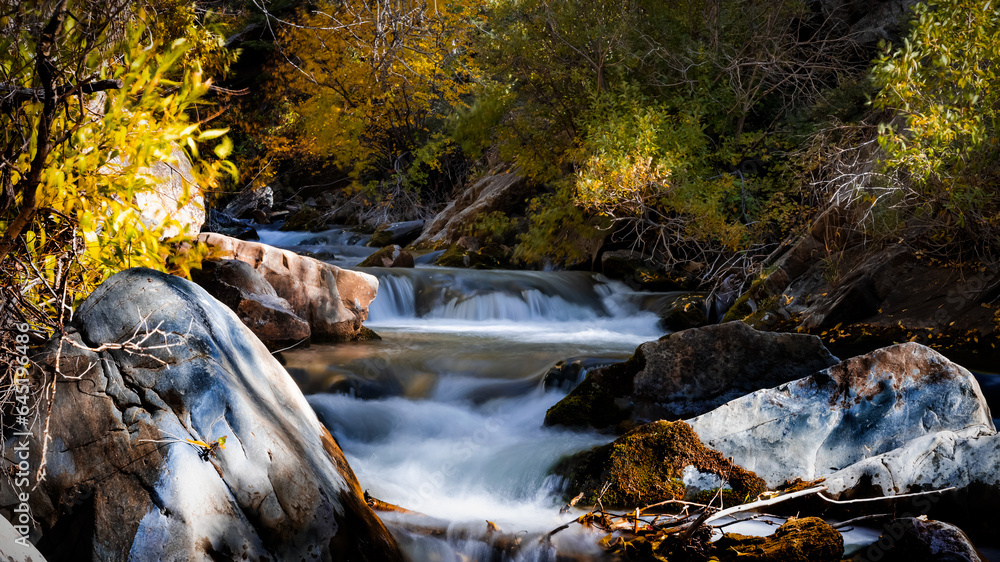Water falls on Big Cottonwood creek in Utah during autumn time,