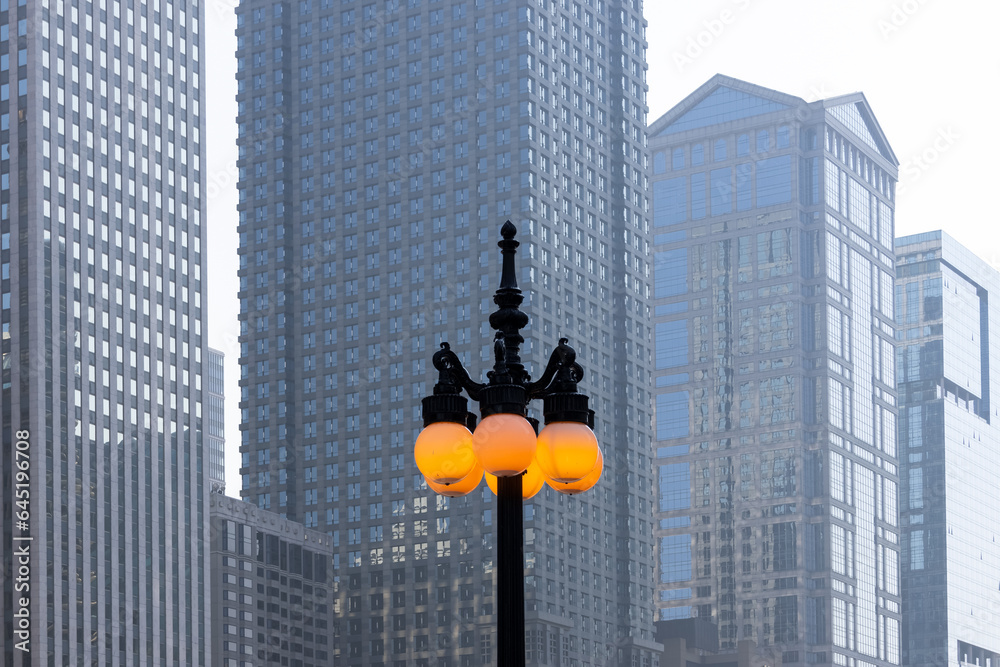 Lamp post with lit ball lights against tall modern buildings in downtown Chicago
