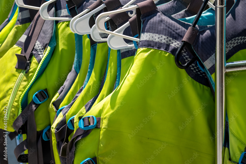 Many green life jackets hanged in a row for canoeing and kayaking use.