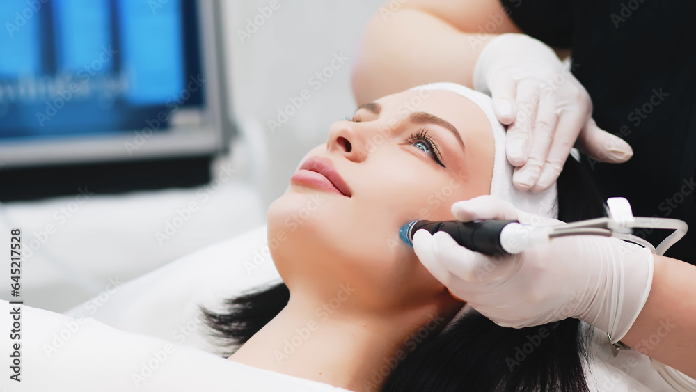 Cosmetologist doing hydrafacial treatment on woman face in beauty clinic
