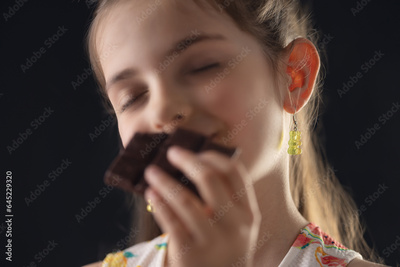 Chocolate and pretty hungry little woman portrait. Beautiful girl ready to eat chocolate bar.