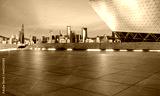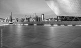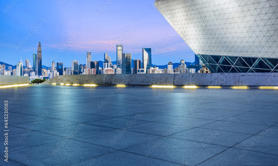 City square and skyline with modern buildings in Shenzhen at sunset, Guangdong Province, China.