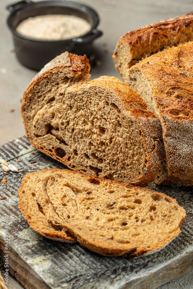 Sliced bread. Baked bread. Craft bakery on wooden board, banner, menu, recipe place for text, top view