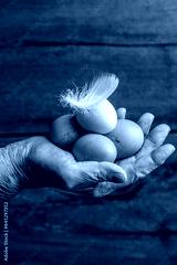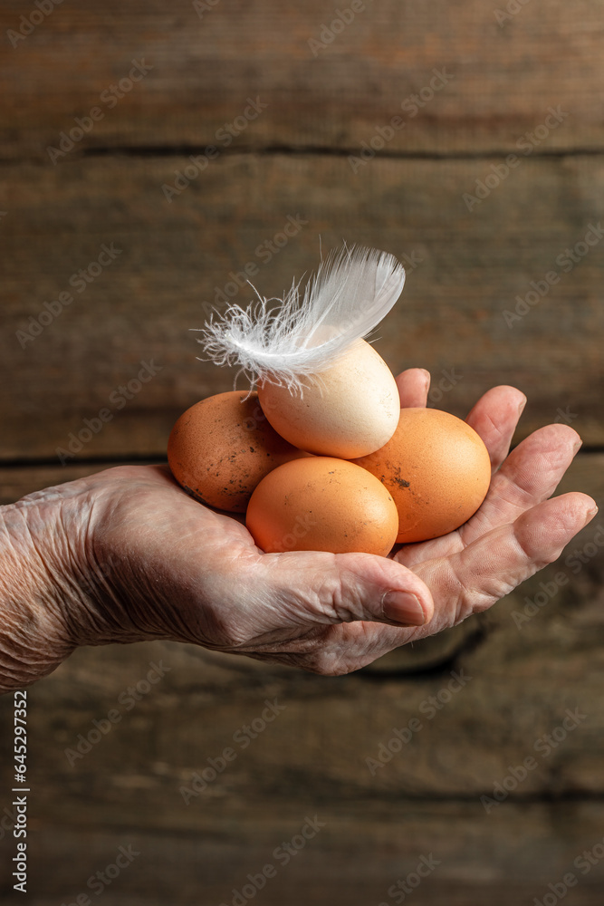 A woman takes chicken eggs from the nest. Concept of agriculture, bio and eco farming, bio food products. place for text