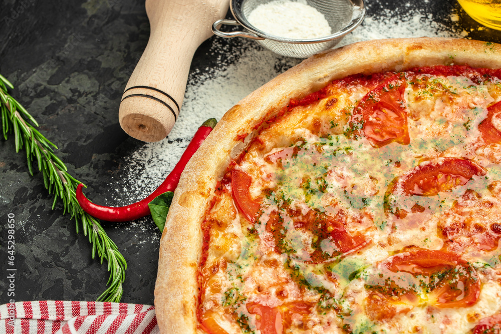 pizza with tomato, mozzarella and arugula, caprese pizza Italian pizza on a dark background, Fast food lunch. top view. place for text