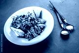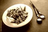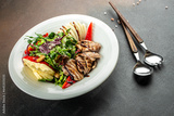 Sliced grilled beef steak with green leaves salad on a dark background. banner, menu, recipe place for text, top view