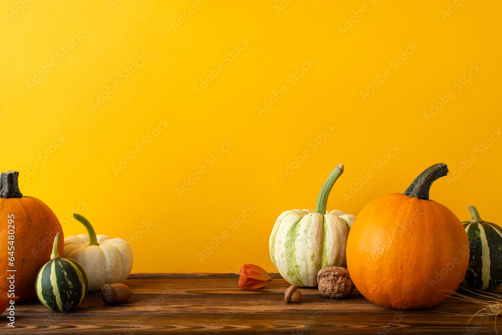 Get into the harvest spirit! Side view shot of a wooden table adorned with a variety of autumn treasures, like pumpkins, pattypans, walnut, physalis, acorn, wheat set against warm, inviting background