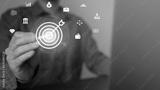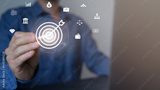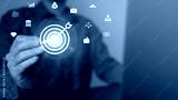 Digital marketing. Businessman touching darts aiming at the target center with icon network connection. Business goal and technology concept.