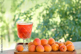 Apricots compote or sweet fruit wine in glass goblet and fresh ripe apricots close up on wooden table outdoor. organic healthy dessert of delicious fruits, full vitamins. summer harvest season