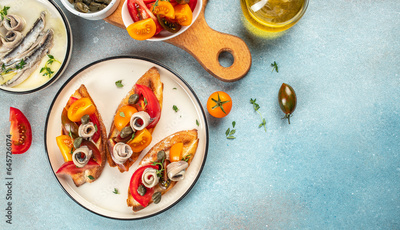 Tapas with anchovies and tomatoes on a blue background, Long banner format. top view