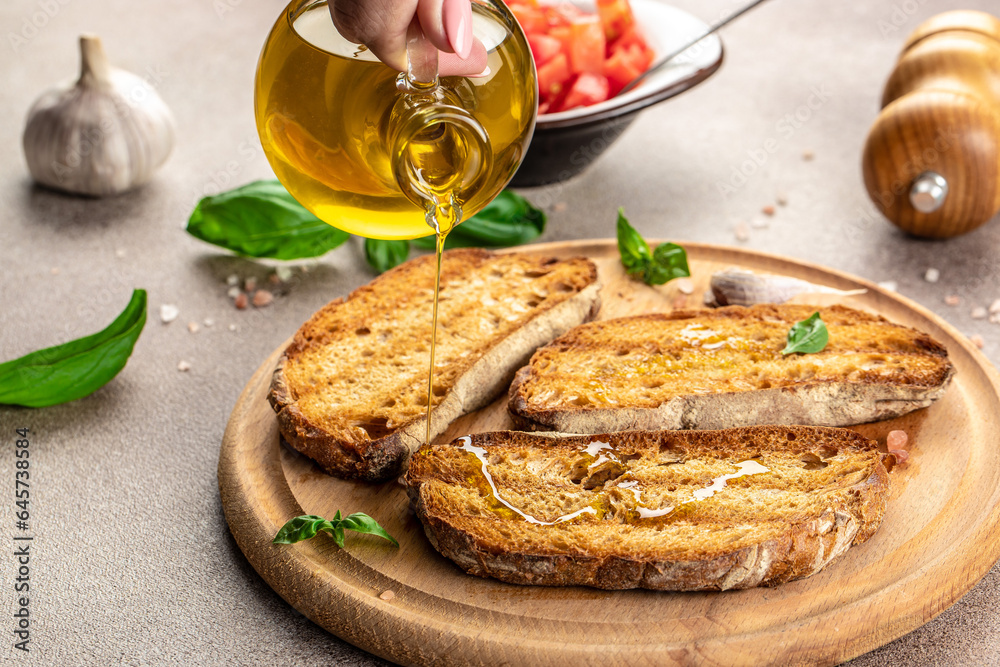 Traditional toasted Italian bruschetta seasoned with olive oil. Delicious breakfast or snack