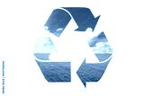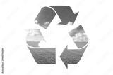 Illustration recycling symbol of nature elements, green foliage, blue sky and sea water isolated on white background.