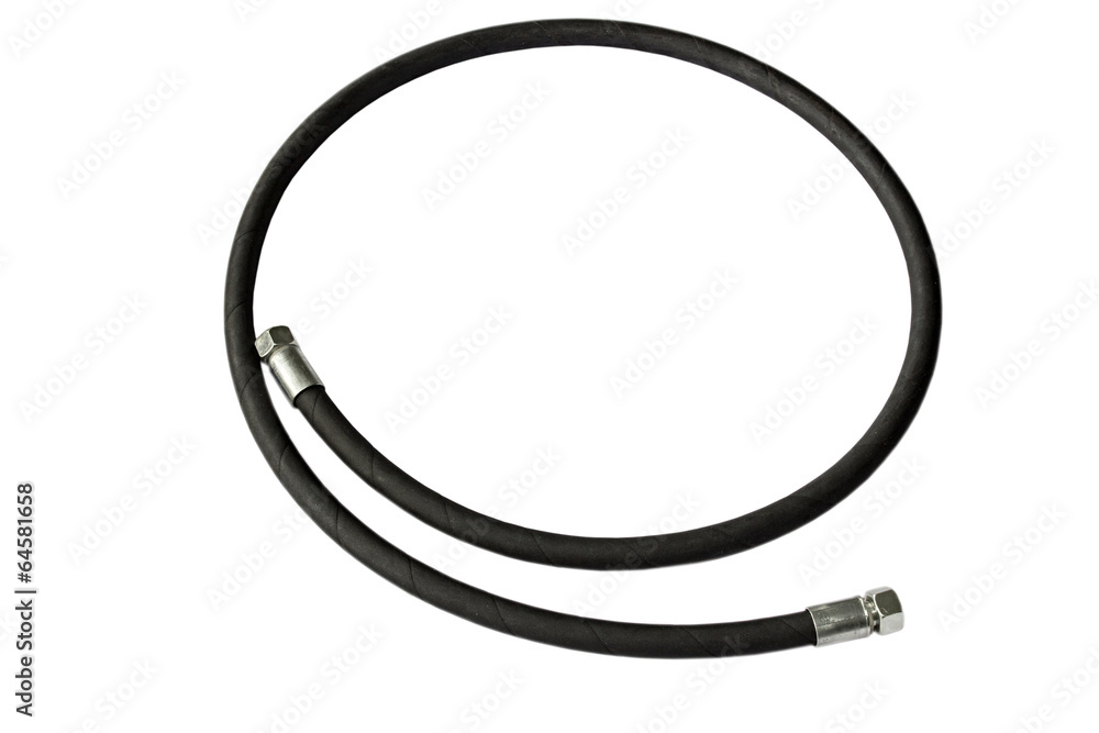 Rubber industrial hydraulic hose with fittings.