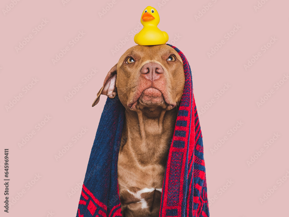 Cute brown dog, blue towel and yellow rubber duck. Grooming dog. Close-up, indoors. Studio photo. Concept of care, education, obedience training and raising pets