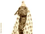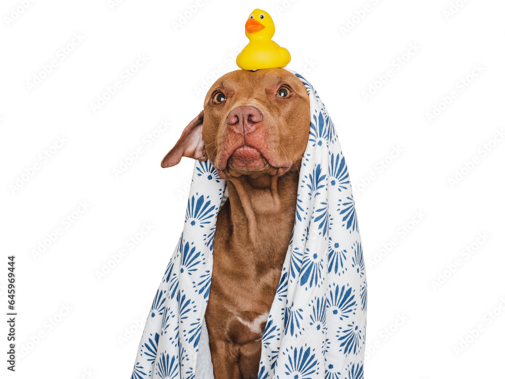 Cute brown dog, white towel and yellow rubber duck. Grooming dog. Close-up, indoors. Studio photo. Concept of care, education, obedience training and raising pets