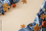Create an autumn-inspired ambiance. Top view shot of warm blanket, colorful pumpkins, acorns, dry leaves on pastel beige background with promo spot