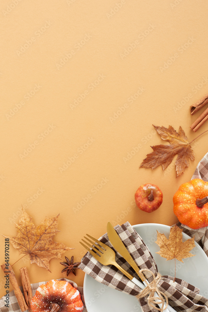 Stunning autumn-themed table decor. Top view vertical shot of plate, cutlery, tablecloth, pumpkins, cinnamon sticks, anise, acorns, fallen leaves on pastel brown background with ad space