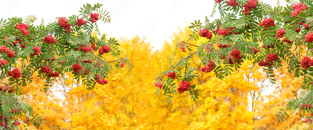 autumn background with rowan tree. landscape with red rowan berries on tree branches, abstract natural backdrop. fall season, harvest time concept. template for design. banner