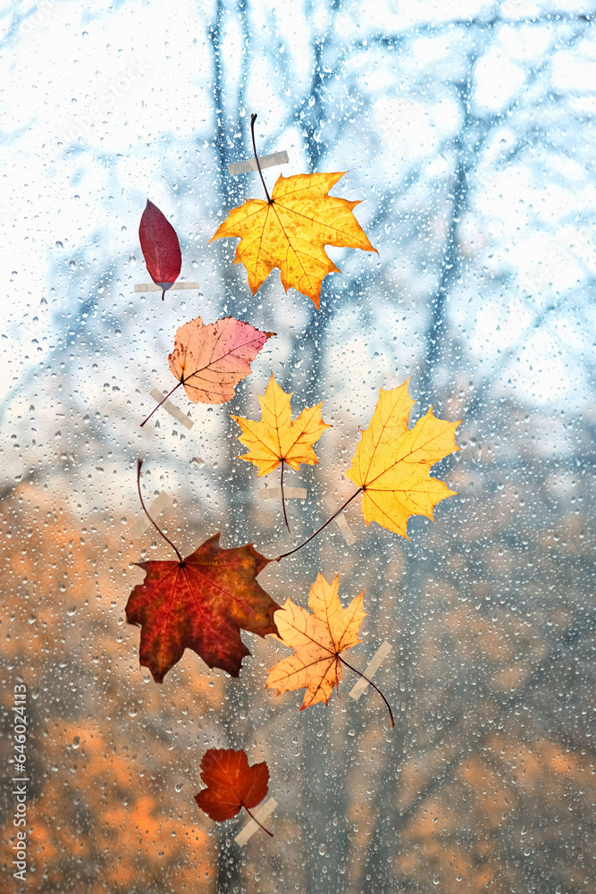 autumn background. window glass in raindrops with bright autumn leaves, abstract backdrop. fall season concept. rainy day