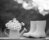 watering can with chamomile flowers and yellow rubber boots in garden, natural abstract background. beautiful seasonal image with flowers. summer time. copy space. template for design