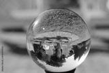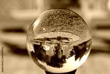 Blick durch eine Glaskugel in einen Hausgarten im Sommer
