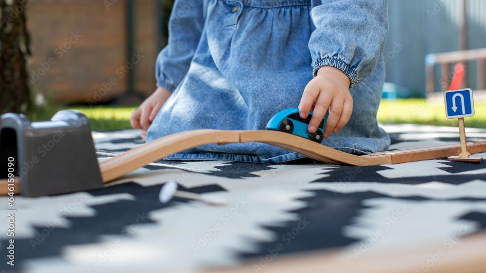 Close-up of a child's hands playing with a wooden train on the railway. Children's development