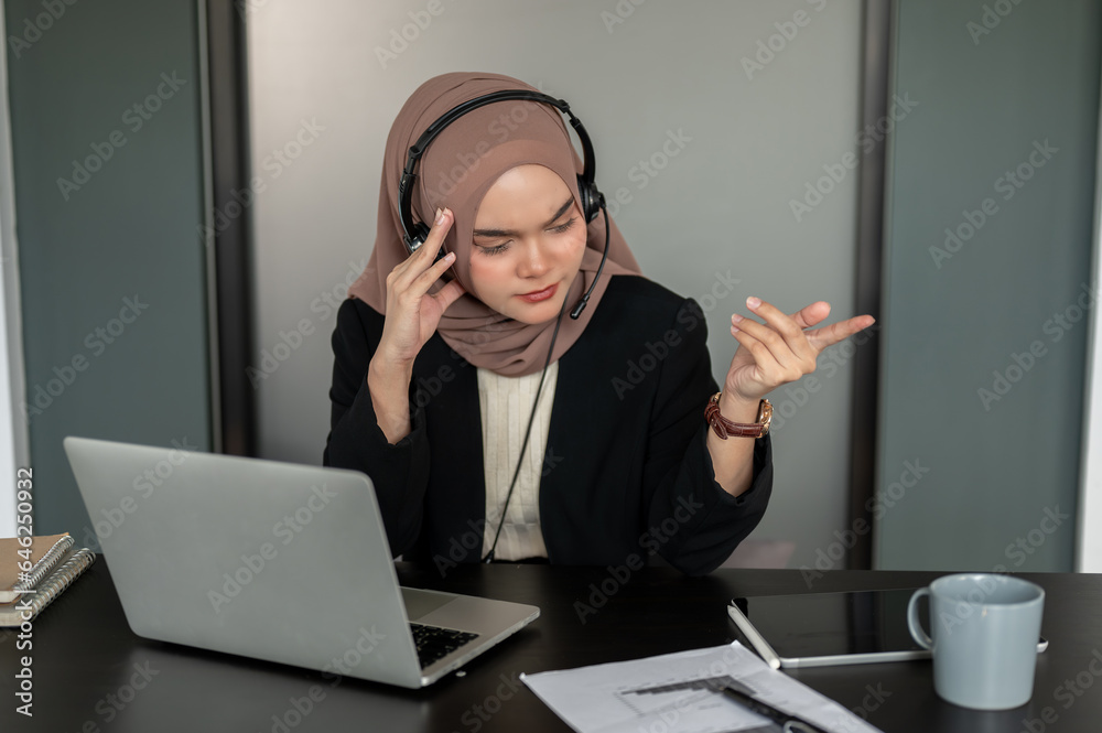 A confused Asian Muslim female customer call centre operator resolves customer issues over the call.