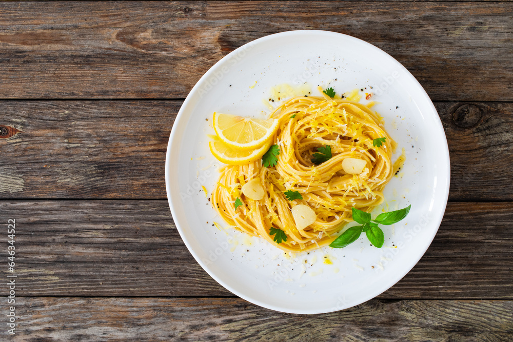 Linguine al limone - pasta with lemon and parmesan on wooden background