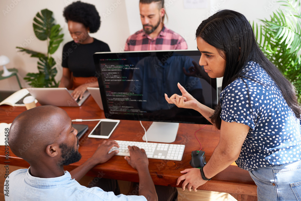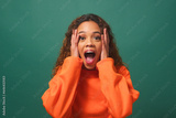 Happy shocked and surprised multi-ethnic woman, green studio background