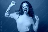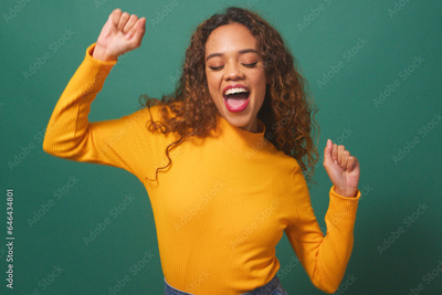Happy young woman dancing, having fun, green studio background