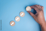 startup leadership, planning for business strategy innovation performance target solution project marketing achievement. man holding wood rocketship and arrow concept on background.