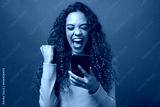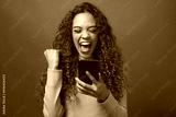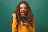Young biracial woman cheers after reading text, green studio background
