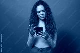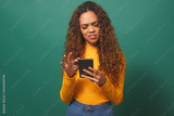 Young woman reads text message, disappointed confused, green studio background