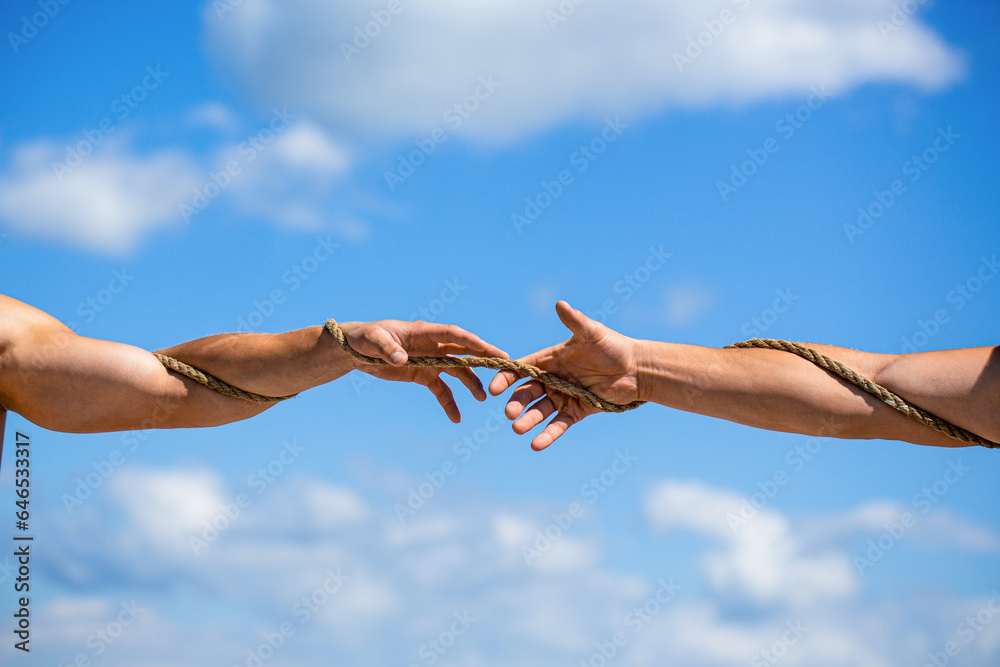 Hand holding a rope, climbing rope, strength and determination. Rescue, help, helping gesture or hands. Conflict tug of war. Two hands, helping hand, arm, friendship. Rope, cord