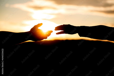 Giving a helping hand. Rescue, helping gesture or hands. Two hands silhouette on sky background, connection or help concept. Outstretched hands, salvation, help silhouette, concept help