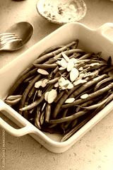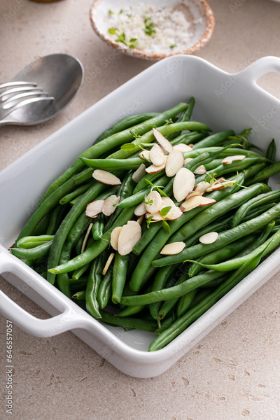 Green beans topped with almonds in a baking dish, traditional side dish for dinner or celebration