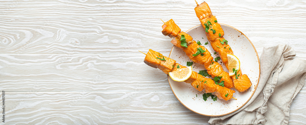 Grilled barbecue salmon skewers seasoned with green parsley and lemon on ceramic plate on white wooden rustic table background top view, healthy eating. Copy space