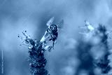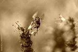 frontal view of a flying bee starting from an Agastache flower