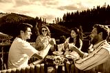 Group of friends drinking cocktails and enjoying meal while sitting on restaurant terrace in mountains
