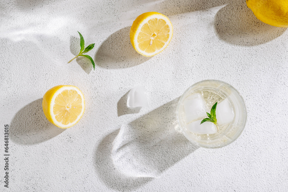 Refreshing drink with ice, lemon and mint. Cold lemonade on white background