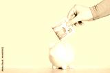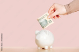 A woman's hand puts a ten dollar bill in a piggy bank. Saving money for future goals