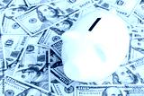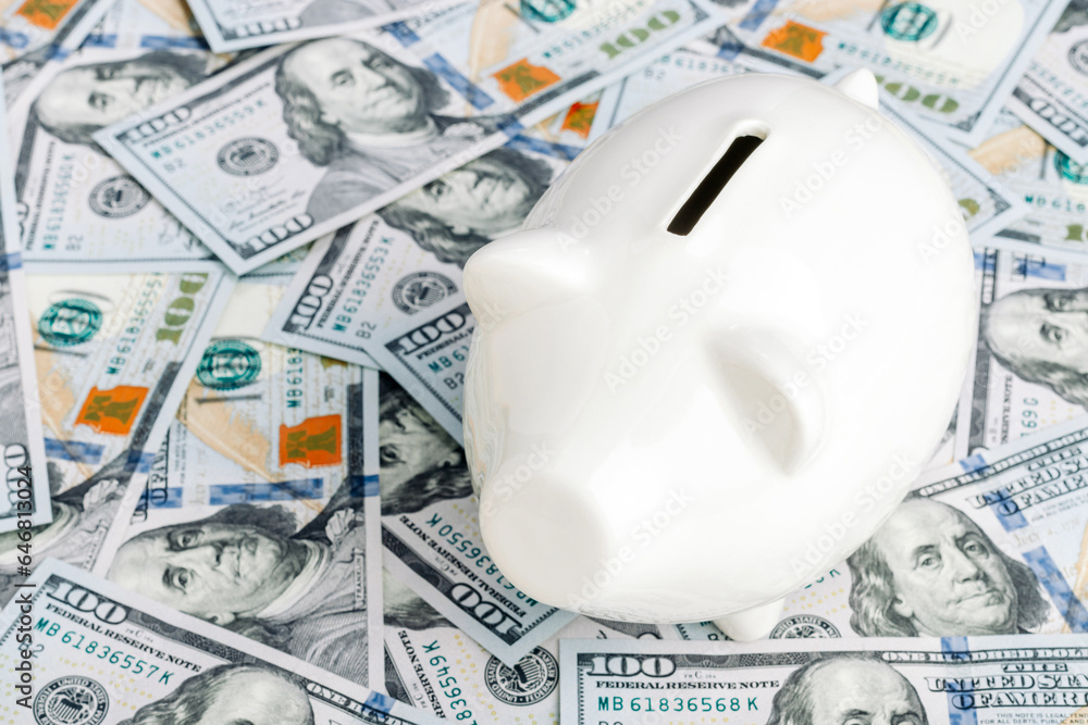 A white piggy bank stands on pile of hundred dollar bills. Wealth and prosperity concept
